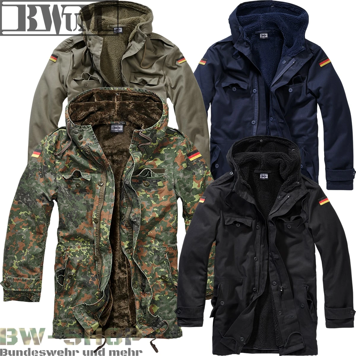 Unser neuer BWuM Parka für den Winter ist sehr angenehm zu Tragen und hält Sie perfekt warm. Auch die Bundeswehr hat dieses Modell jahrelang getragen. Da es ein Modell nach Bundeswehr TL ist, besitzt dieser Parka auch die gleichen Eigenschaften. Robuste Baumwollqualität und herausnehmbares, plüschiges Innenfutter sind nur zwei von vielen wichtige Eigenschaften. Der olive Parka ist das Modell vom Original Feldparka und der blaue Parka das Modell vom Original Bordparka. Den Parka in Flecktarn gibt es bis Dato so noch nicht und dieser ist exklusiv von uns angefertigt in der Standardfarbe der Bundeswehr.
